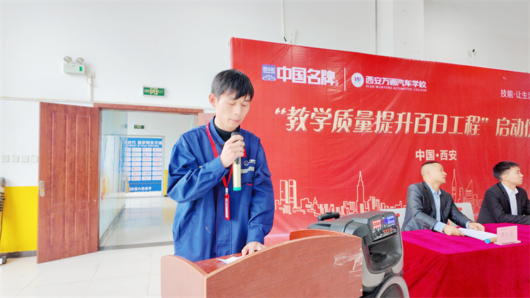 二、师生同心·共话成长 西安万通 学生代表王震杰在发言中激动地表示:“这百日是我们把‘扳手练熟、技术学精’的黄金时间,更是我们朝着‘能修善诊的汽修人’目标冲刺的关键阶段。”他号召全体同学珍惜实训机会,积极参与技能大赛,严守课堂规范,用实际行动回应学校的精心培养。