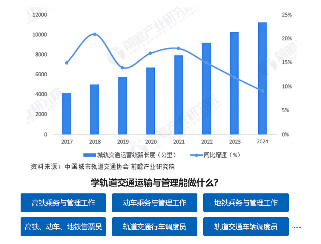 目前,我国已成为全球最大轨道交通市场,2023年全年轨道交通客运总量达到了294.7亿人次,创下了历史新高,轨道交通行业当前仍处于快速发展阶段,对运输管理人才的需求量巨大。