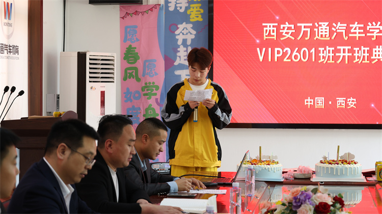 近日,西安万通汽车学校VIP2601班开班典礼在三楼会议室隆重举行。院校校长李登宝、校区主任张见兵、学生处主管万云飞、等领导出席,班主任张军利、主持人李小安与VIP2601班全体42名同学共同参与,共同见证这一庄严而温暖的时刻。